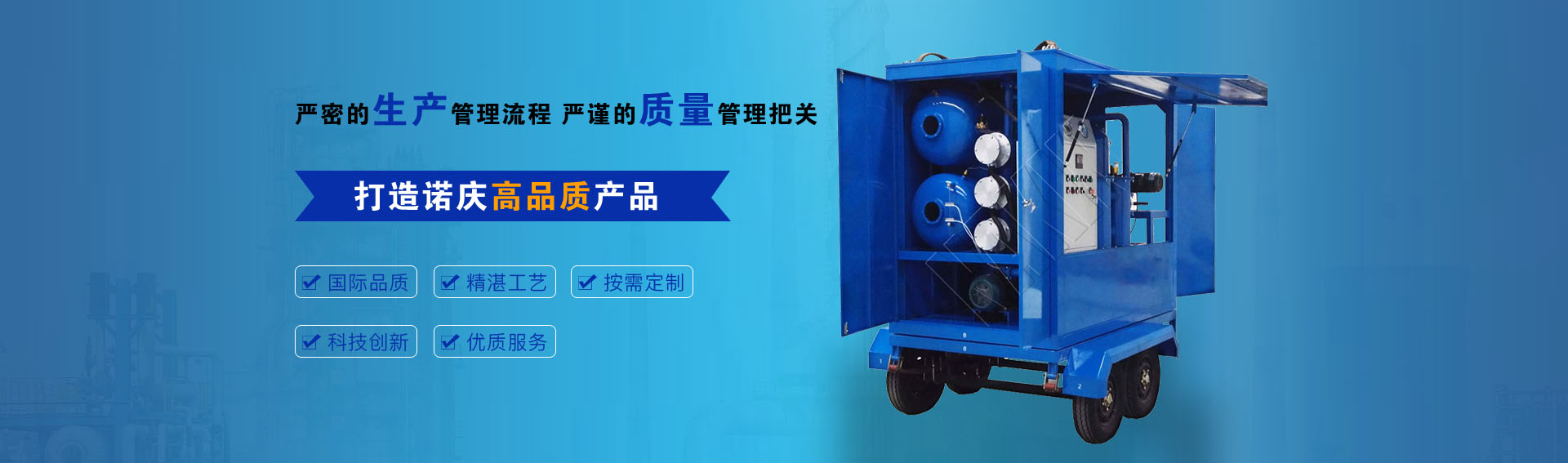 公司通過ISO9001-2015質(zhì)量管理體系認(rèn)證,CE歐盟認(rèn)證,諾慶公司所有濾油機(jī)配套產(chǎn)品均采用國內(nèi)外知名品牌,經(jīng)過多年的使用,具有質(zhì)量可靠,性能優(yōu)良。公司擁有完備的檢測(cè)儀器和檢測(cè)設(shè)備,所有產(chǎn)品出廠前經(jīng)過嚴(yán)格測(cè)試,保證每一臺(tái)產(chǎn)品合格出廠。生產(chǎn)實(shí)力雄厚